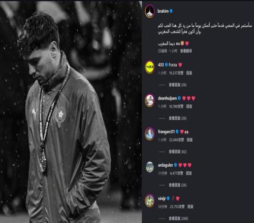 非洲杯决赛罚失关键点球后,卜拉欣-迪亚斯在社交媒体公开道歉,表示承担全部责任。多位皇马队友在其评论区留言送上爱心符号。