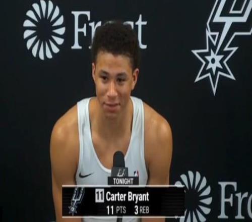 赛后,马刺队在去年选秀大会上选中的14号秀卡特-布莱恩特出席了发布会,他用幽默的方式称赞了队友文班亚马的防守能力:“我认为我可以成为世界第二好的防守球员,因为很难超过身高7尺5寸(约2.24米)且移动速度极快的球员去成为世界第一的防守球员。”